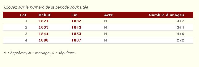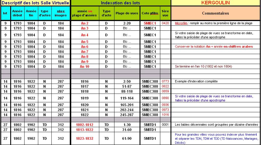 Il importe donc, pour pouvoir dès à présent améliorer la consultation des registres, de procéder à une indexation manuelle des différents lots, pour pouvoir repérer plus facilement les naissances (N), mariages (M), décès ( D) d’une année particulière ou les décades des tables décennales (TD) à partir des lots, des plages de dates et des numéros de vues de la salle virtuelle.