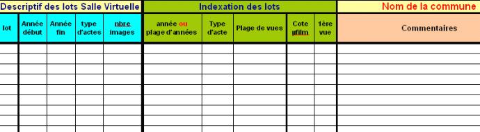 - Que dois-je inscrire dans les colonnes "Lot, Année début, Année fin, Type d’actes, Nbre d’images" ?