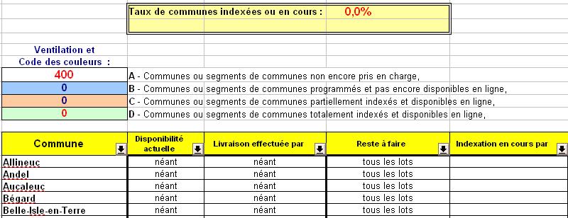 Pour vous faciliter la prise de décision, les communes ont été classées en quatre catégories selon le temps nécessaire à l’indexation, avec code de couleurs associé, sur la fiche de suivi : "très court", "court", "moyen", "important". Le nombre de lots figure en vis à vis du nom de la commune.