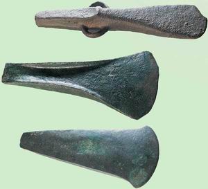et de deux haches à talon, bien conservées.