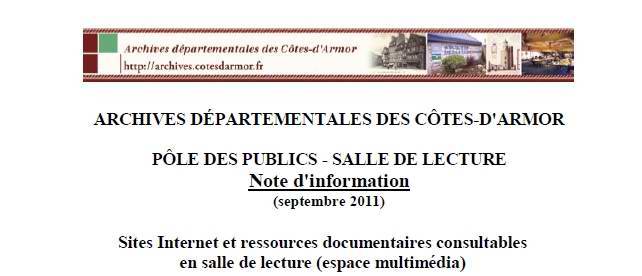 Information transmise le 19 septembre 2011 par Madame Anne LEJEUNE, directeur des Archives départementales des Côtes d’Armor