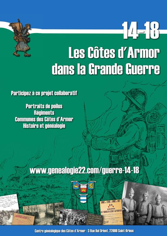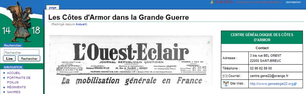 Le Centre Généalogique des Côtes-d’Armor (CG22) ouvre un site Wiki qui permettra à ses adhérents de rendre hommage aux combattants des Côtes-du-Nord, de leur parentèle proche ou éloignée, qui ont participé au conflit de la première guerre mondiale.