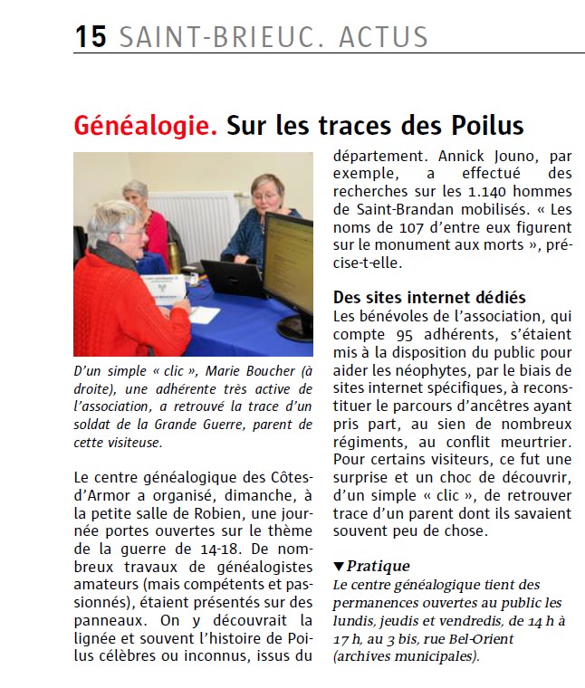 Le Centre Généalogique des Côtes-d’Armor a organisé le 8 février dernier, dans la salle rénovée de la Maison de quartier de Robien, sa troisième Portes Ouvertes.