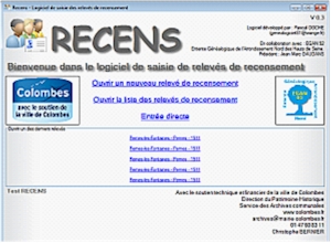 RECENS est un logiciel de saisie des relevés de recensement de la population, utile aux associations généalogiques, archives communales et départementales.