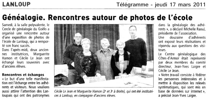 Le CG22 était présent à cette manifestation, organisée par le cercle généalogique du Goëlo, le samedi 12 mars 2011 dans la salle polyvalente (salle des fêtes de Lanloup).