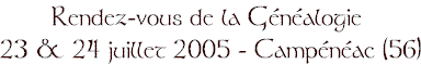 De 10h à 18h, la Librairie de La Voûte vous accueillera sur un espace de 20m2 de stand et 800m2 de pelouse.. Grande première à Campénéac (56), les 23 & 24 juillet 2005 : les Rendez-vous de la Généalogie (en partenariat avec La Librairie de la Voûte) continuent leur carrière à la Salle polyvalente de 10 h à 19 h le samedi et de 10 h à 18 h 30 le dimanche. Un hall d'exposition accueillant une vingtaine d'exposants (associations & professionnels du monde généalogique), des démonstrations de logiciel (GénéaTique 2004, Genealogos, Hérédis, Sajef, Descendance Capétienne), des bases de données, des séances de dédicace, plusieurs expositions : les personnages célèbres du Morbihan, Cartes postales anciennes, les vieux métiers et sans oublier l'exposition des arbres généalogiques du concours des apprentis généalogistes. Entrée libre et gratuite Vous pourrez également participer à des ateliers tables rondes sur les bases de la généalogie, les archives militaires et les archives notariales, les recherches en Espagne animées par Patrick GOSSEIN et Jean-Pierre CAZAUX, etc... Des rencontres avec des auteurs: Jean-Pierre Cazaux, etc… Participants : Archives & Culture, Association Généalogique Vertavienne, Cazaux Jean-Pierre (Généalogiste Professionnel), Chambre des Généalogistes Professionnels (CGP), Cercle généalogique du Morbihan, Cercle généalogique des Côte d'Armor, Cercle généalogique d’Ile et Vilaine, Cercle Généalogique de l’Ouest, Cercle Généalogique du Grand-Fougeray, Cercle Généalogique du Finistère, Cercle Généalogique Bretagne, Centre Est, Editions Généalogiques de la Voûte, Gé-Magazine, Généalogos (Logiciel), GénéaTique (Logiciel), Gossein Patrick (Généalogiste Professionnel), Hérédis (Logiciel), Les Mormons / Eglise de Jésus Christ des Saints des Derniers Jours, Librairie de la Voûte, Mémoire Vivante de Frégréac, Produits régionaux, Rdv-généalogie, Revue Française de Généalogie, SAJEF, Section de généalogie de la société " Les Amis de Guérande ", Voyages Généalogiques, etc… Nous contacter par courrier à : Les Rendez-vous de la généalogie 24, rue de la Voûte 75012 PARIS E-Mail : rdvgene@voila.fr Site : http://mapage.noos.fr/voute/rdvgene/campeneac/accueil1.html ---------------------------------------------------- Librairie de la Voûte 24 rue de la voûte 75012 PARIS Email : voute@noos.fr Site : http://www.lavoute.net Site : http://www.lavoute.com.fr |