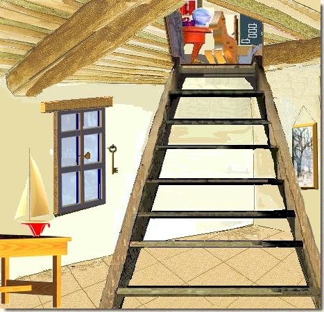 Projet d'un dessin exécuté sous Paint, la vue intérieure est une image pour mes futures pages ayant pour thème le grenier de mes ancêtres.
