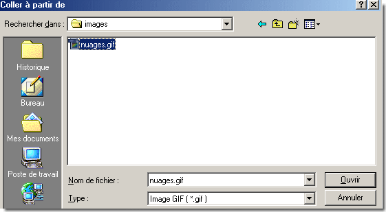 Note : Vous pouvez annuler jusqu'à trois modifications en cliquant dans le menu Édition sur Annuler. Étape 4 : Enregistrer l'image des nuages présente en haut dans cette page dans dossier images, puis avec l'outil entourer le nuage ; une petite partie suffit ; choisir un des fonds parmi ceux proposés ci-dessous, mieux votre image perso enregistrée au préalable dans le fichier images). Étape 5 : Dans le menu Édition choisir Coller à partir de ... Ouvrir le dossier images puis sélectionner nuages.gif. Si tout ce passe bien cela donne ceci :