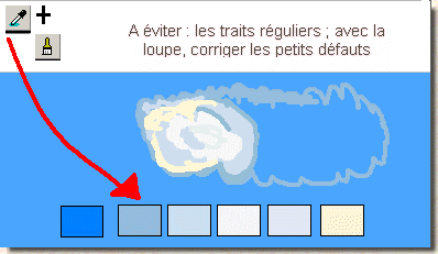 Remarque : Vous pouvez agrandir la vue avec l'outil loupe pour corriger les quelques défauts ou pour peaufiner à l'aide de la brosse. Pour crér un nuage à partir des couleurs, commencer à l'étape 1, puis à l'aide la pipette dans la boite à outils, choisir la couleur la plus foncée ; créer des cercles à l'aide du pinceau et recommencer en prenant une couleur plus claire et ainsi de suite. On peu ensuite, au final, rajouter une couleur plus foncée ou plus claire etc...