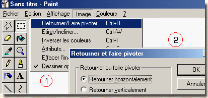 Votre image se place dans l'angle en haut à gauche : elle est entourée de traits pointillés ; la déplacer à l'endroit désiré. Si votre image n'est plus sélectionnée c'est à dire entourée des pointillés, cliquer sur le bouton rectangle Cf. fig.5, voir pour sélectionner une zone de forme rectangulaire : puis déplacer votre pointeur pour entourer la zone de dessin complète. Etape 6 : Quand votre image est placée et encore sélectionnée, avant de cliquer dans une partie extérieure de l'image, cliquer sur le bouton droit de la souris ; choisir dans le menu contextuel copier et encore une fois sur le clic ; droit puis, sur coller. Etape 7 : Cliquer dans le Menu ; puis sur Image (1) puis sur Retourner ou faire pivoter, cocher l'option Retourner horizontalement ; puis sur OK. (2) Fig.8.