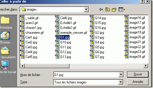 Quand les deux règles sont placées ainsi, enregistrer l'image dans le fichier images sous le nom echelle.bmp par exemple. Remarque : pour faire de la place dans votre répertoire éliminer les deux images enregistrer précédemment. Le résultat obtenu doit donner ceci : Fig.6 Etape 4 : Ouvrir la page des gabarits, (Lien vers le menu gabarits cliquer ici) ; choisir ceux qui vous conviennent ; enregistrer les images d'un clic droit. Enregistrer sous... dans le dossier images. Pour commencer nous choisissons ici le gabarit G1. Dans pignon maison pour la base de la maison. Remarque : Par souci de gain de poids et afin d'éviter les doublons, toutes les figures sont orientées vers la droite : nous avons ici donc un pignon de maison gauche : pour obtenir le même pour le côté droit, il vous faudra procéder de la façon suivante : voir l'exemple, étape 5 : une fois votre image collée dans votre page Echelle et ainsi de suite pour toutes les autres images. Etape 5 : Dans le Menu pointer sur Édition puis Coller à partir de... ; dans le répertoire images choisir votre image (le pignon n°1dans notre exemple, image G1) Si toutes vos images ne s'affichent pas, dans Type la fenêtre du bas, choisir Tous les fichiers images : comme sur cet exemple, sélectionner l'image choisie ; puis cliquer sur Ouvrir : l'image se colle dans la page de Paint.